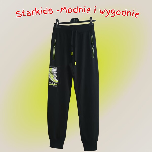 Spodnie dla chłopca czarne dresowe z limonkowym butem .